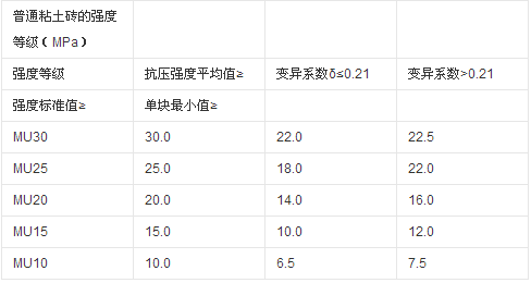2、强度等级。强度等级根据10块砖的抗压强度平均值、标准值或最小值划分,共分为MU30、MU25、MU20、MU15、MU10五个等级,在评定强度等级时,若强度变异系数δ≤0.21时,采用平均值——标准值方法;若强度变异系数δ>0.21时,则采用平均值——最小值方法。其具体要求如下表所示。